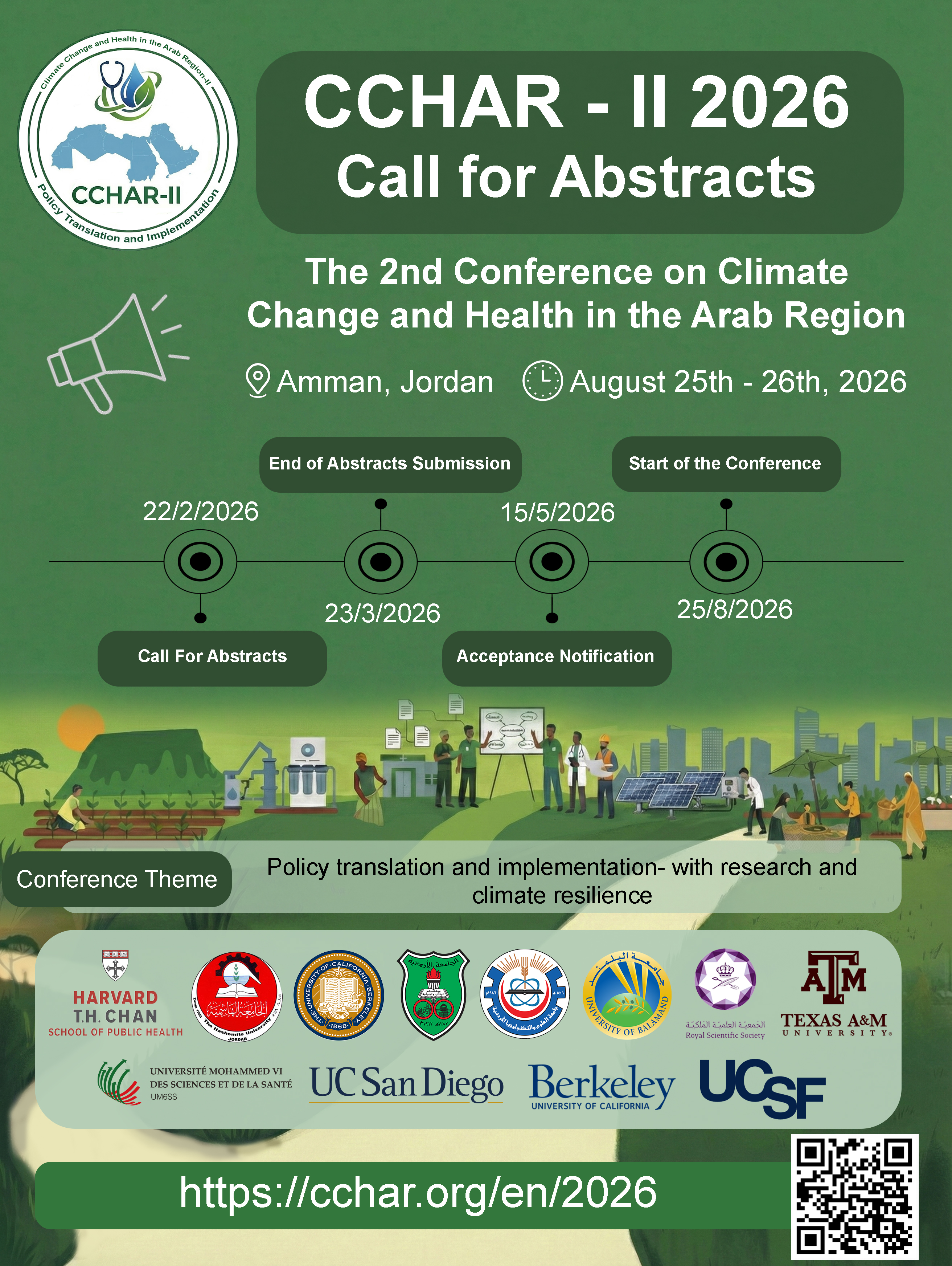 Building on the success of the inaugural CCHAR conference, The 2nd Climate Change and Health in the Arab Region (CCHAR) will be held in Amman, Jordan, from August 25 to 26, 2026, under the theme “Policy Translation and Implementation." The conference aims to move beyond evidence generation toward actionable solutions, focusing on translating climate–health research into effective policies, programs, and on-the-ground implementation across the Arab region.